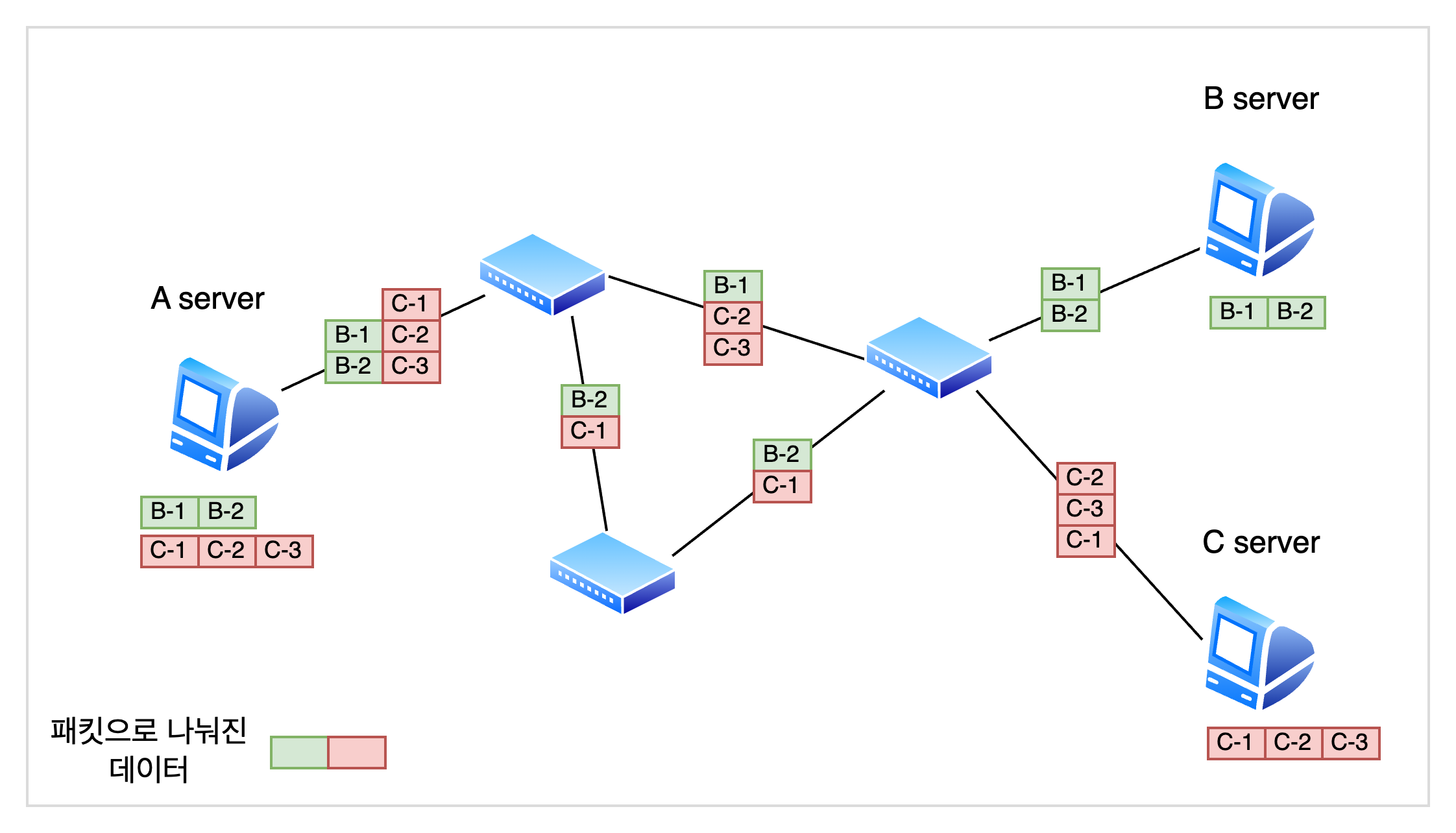참고로 각 서버가 회선으로 바로 연결되는 것이 아니라 위 그림과 같이 서버 사이에 ‘교환기(Switching Exchange)’를 두어 이를 거쳐서 통신하게 되는데, 교환기는 통신하는 두 서버 사이에서 전용 통신 회선을 미리 설정해 주고 독점하여 사용하게 도와주다가 통신이 끝나면 해제하는 역할을 한다.